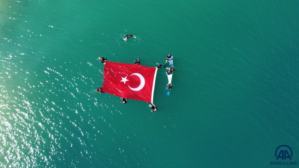 Doğu Deniz Derneği üyesi 12 dalgıç, Büyük Zafer'in 100. yıl dönümü etkinlikleri kapsamında Van Gölü'nde 24 metrekare büyüklüğünde Türk bayrağı açarak 30 Ağustos Zafer Bayramı'nı kutladı.