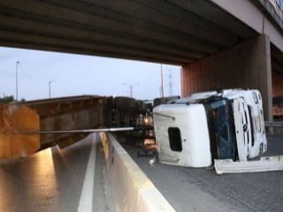 KAMYON YAN YATARAK YOLA DEVRİLDİ