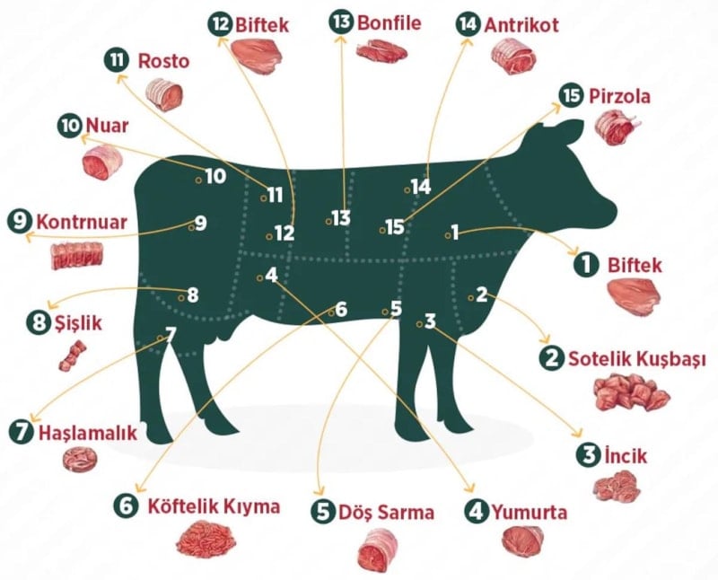 Döş: Göğüs kısmından çıkan, lifli ve yağlı bir et türüdür. Kıyma ve kuşbaşı için oldukça elverişlidir.