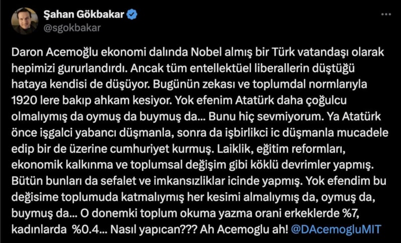 Acemoğlu’nun Atatürk dönemi hakkındaki sözlerine yönelik sosyal medyasından paylaşım yapan Gökbakar, “Daron Acemoğlu ekonomi dalında Nobel almış bir Türk vatandaşı olarak hepimizi gururlandırdı. Ancak tüm entelektüel liberallerin düştüğü hataya kendisi de düşüyor.” dedi.