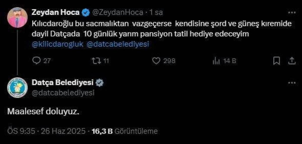 X üzerinden paylaşım yapan bir hesabın Kılıçdaroğlu'nun dönmeyi kabul etmemesi halinde Datça'da tatile göndermek istediğini paylaşmasına ilişkin belediyeden ilginç bir yanıt geldi.