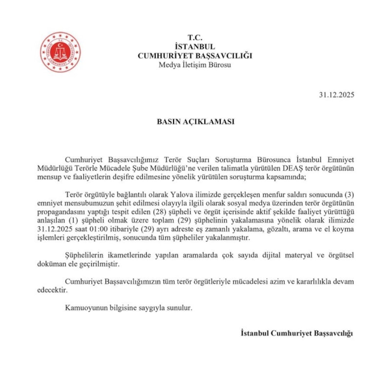 Terör örgütüyle bağlantılı olarak Yalova ilimizde gerçekleşen menfur saldırıda 3 emniyet mensubumuzun şehit edilmesiyle ilgili olarak sosyal medya üzerinden terör örgütünün propagandası yaptığı tespit edilen 28 şüpheli ve örgüt içerisinde aktif şekilde faaliyet yürüttüğü anlaşılan 1 şüpheli olmak üzere toplam 29 şüphelinin yakalanmasına yönelik olarak 29 ayrı adreste eş zamanlı yakalama, gözaltı, arama ve el koyma işlemleri gerçekleştirildi ve tüm şüpheliler yakalandı.
