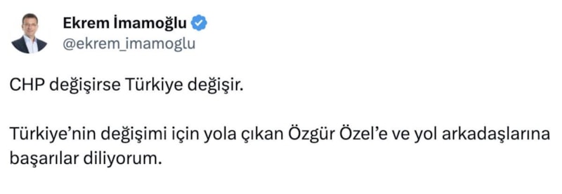 Özgür Özel'in CHP Genel Başkanlığı'na adaylığını açıklaması sonrasında ilk tebrik mesajı Ekrem İmamoğlu'ndan geldi. İmamoğlu o paylaşımına, "CHP değişirse Türkiye değişir" notunu düştü.