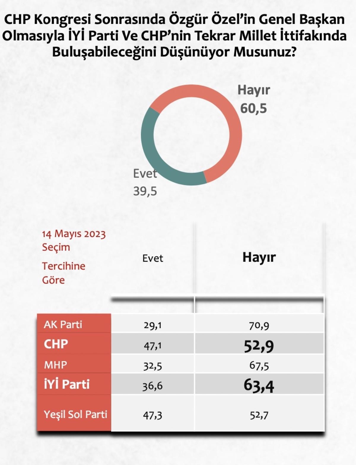 Katılımcılara daha sonra, "CHP Kongresi Sonrasında Özgür Özel’in Genel Başkan Olmasıyla İYİ Parti Ve CHP’nin Tekrar Millet İttifakında Buluşabileceğini Düşünüyor Musunuz?" sorusu yöneltildi.