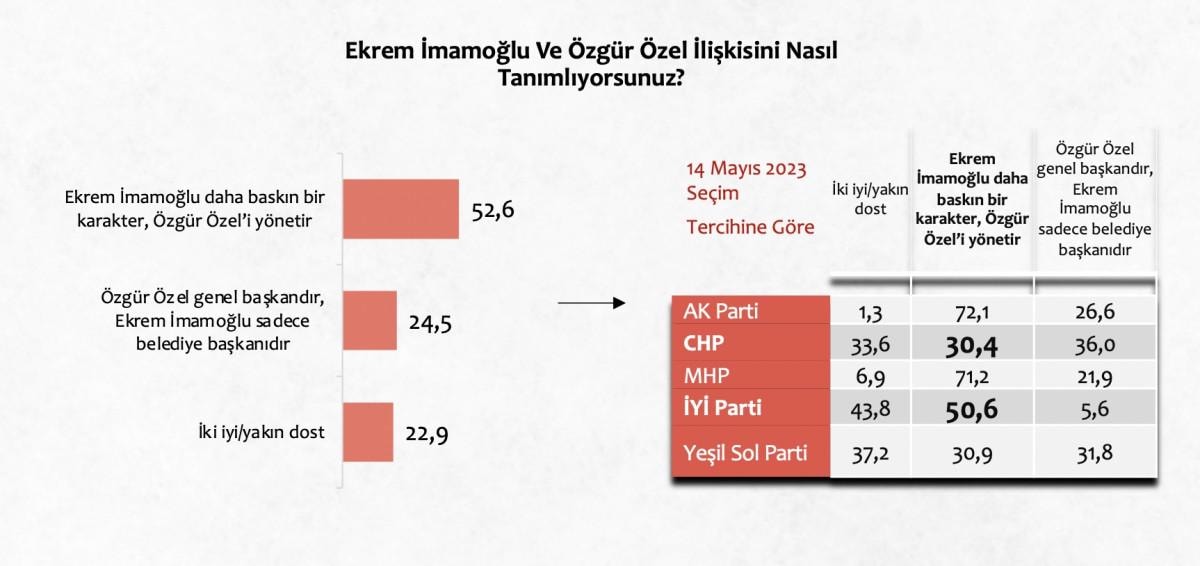 Katılımcıların yüzde 52,6'sı, "Ekrem İmamoğlu daha baskın bir karakter, Özgür Özel’i yönetir" şıkkını seçti.