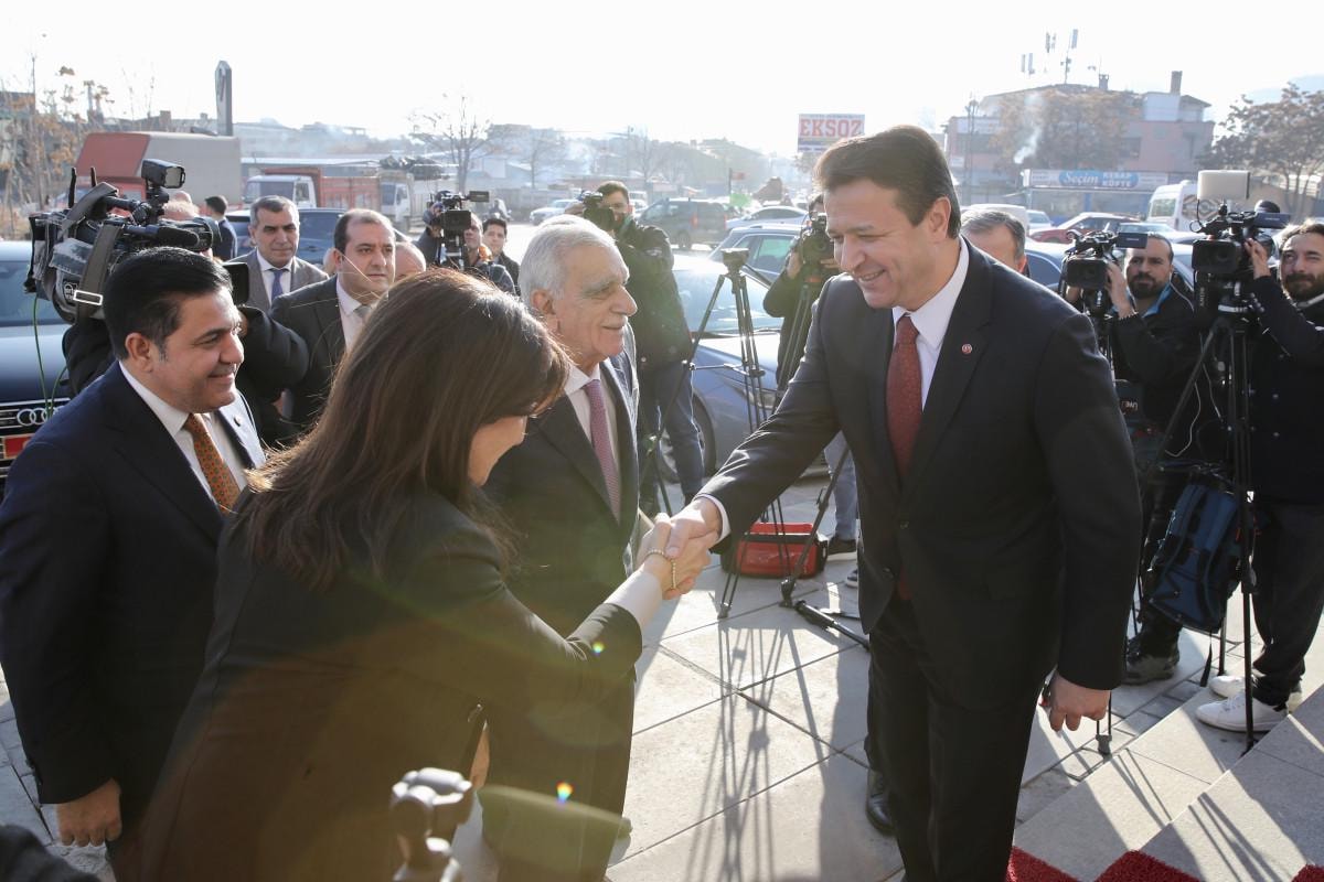 Ziyarete Eski Mardin Büyükşehir Belediye Başkanı Ahmet Türk de eşlik etti. Arıkan, DEM Parti heyetini kapıda karşıladı.