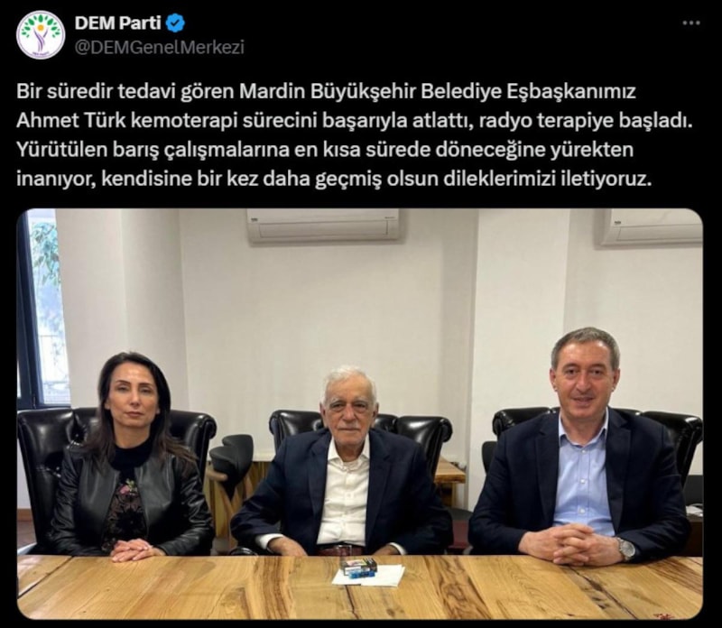 DEM Parti, bir süredir tedavi gören Ahmet Türk'ün kemoterapi sürecini başarıyla atlattığı ve radyoterapiye başladığı duyurdu.
