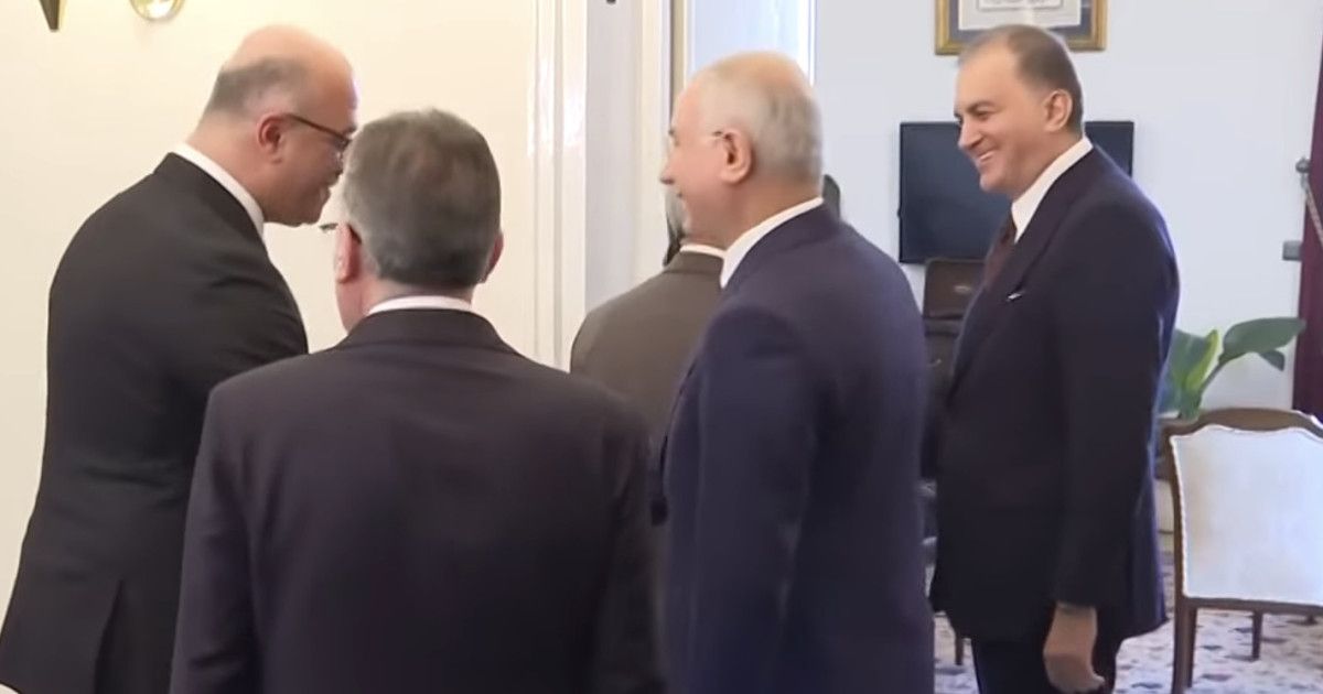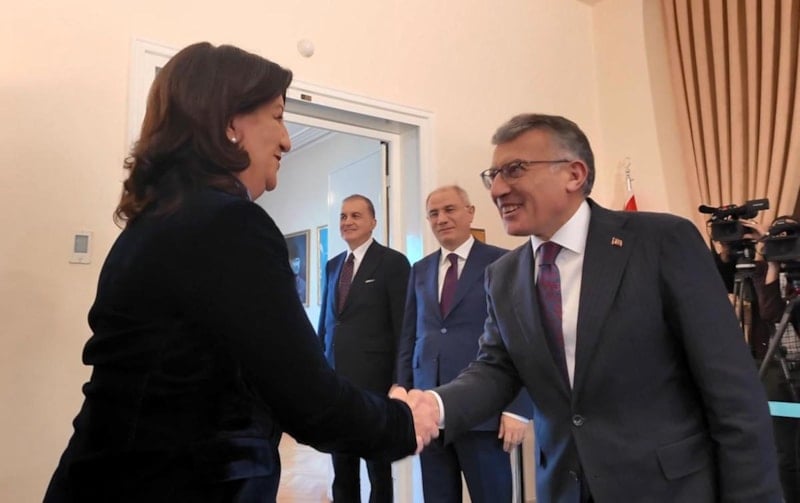 DEM Parti İmralı Heyeti üyeleri Pervin Buldan, Mithat Sancar ve Asrın Hukuk Bürosu üyesi Faik Özgür Erol, AK Parti Genel Başkan Vekili Efkan Ala, AK Parti Sözcüsü Ömer Çelik ve AK Parti Grup Başkanı Abdullah Güler tarafından karşılandı.