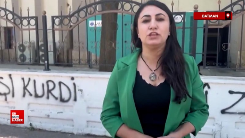 Batman'da Kürtçe trafik uyarılarının silinmesinden dolayı valiliğin önüne gelen DEM Partili Zeynep Oduncu, elindeki boyayla Kürtçe yazılar yazdı, ardından da duvarın önünde açıklama yaptı.