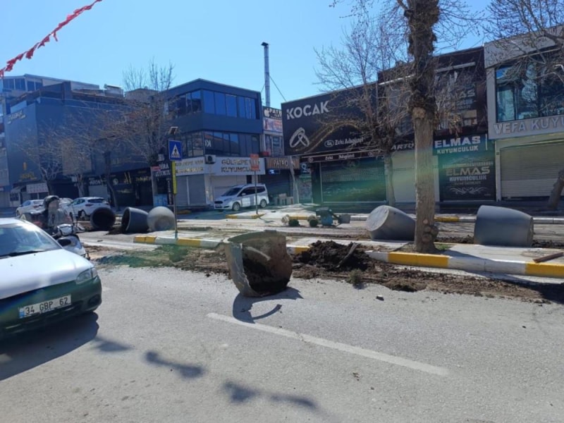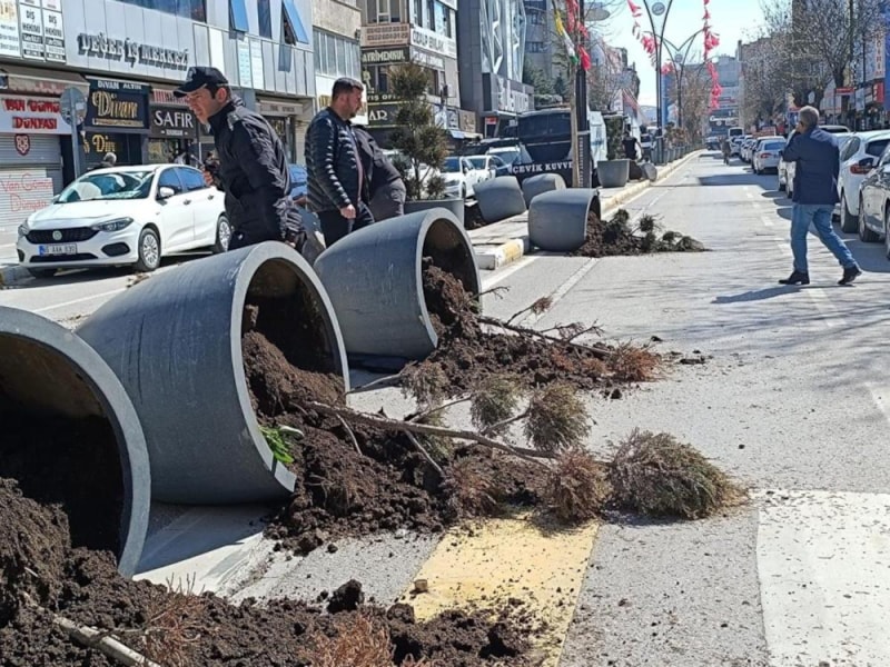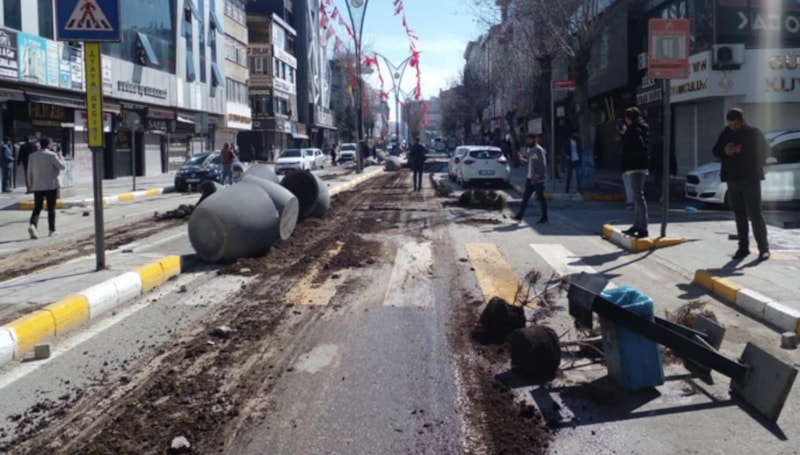 Polisin uyarılarına rağmen caddeye çıkan bir grup, refüjdeki saksıları devirdi.