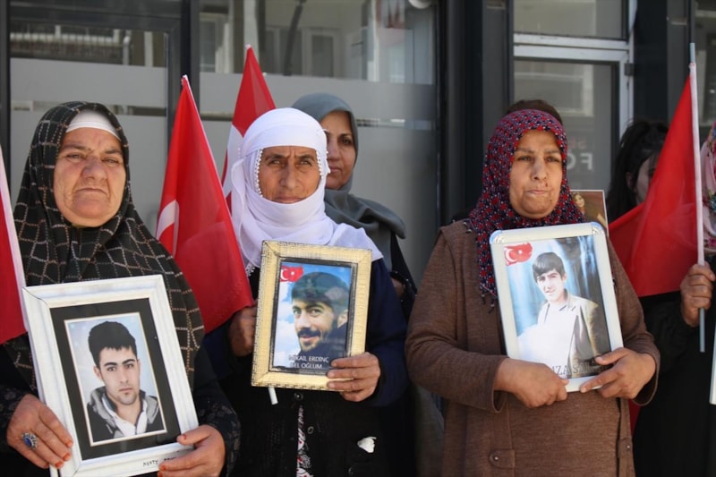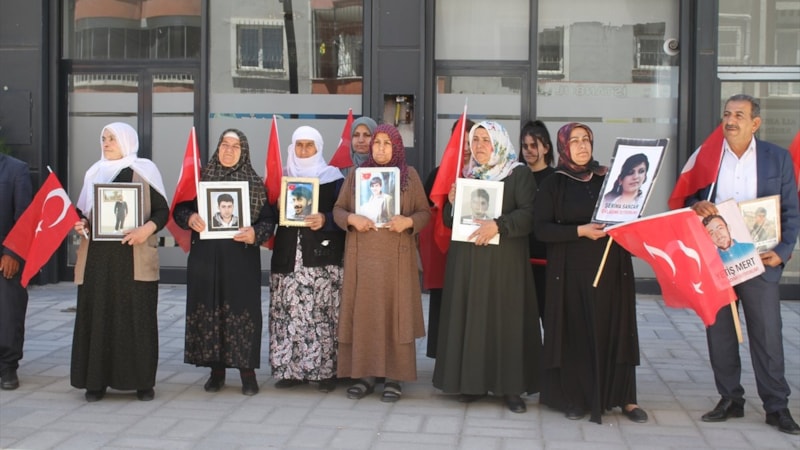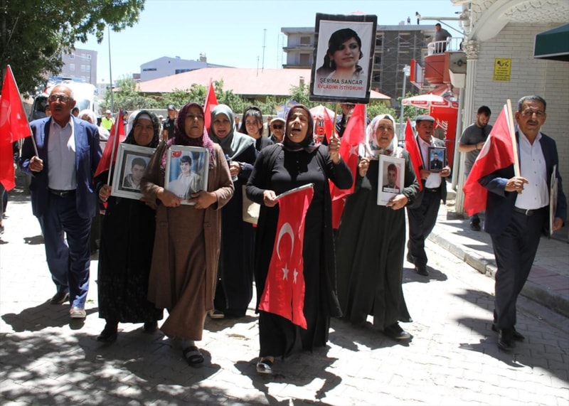 Menekşe Sokak'ta bir araya gelen aileler, Türk bayrakları ve dağa kaçırılan evlatlarının fotoğraflarını taşıyarak DEM Parti İl Başkanlığı binasının önüne kadar yürüdü.