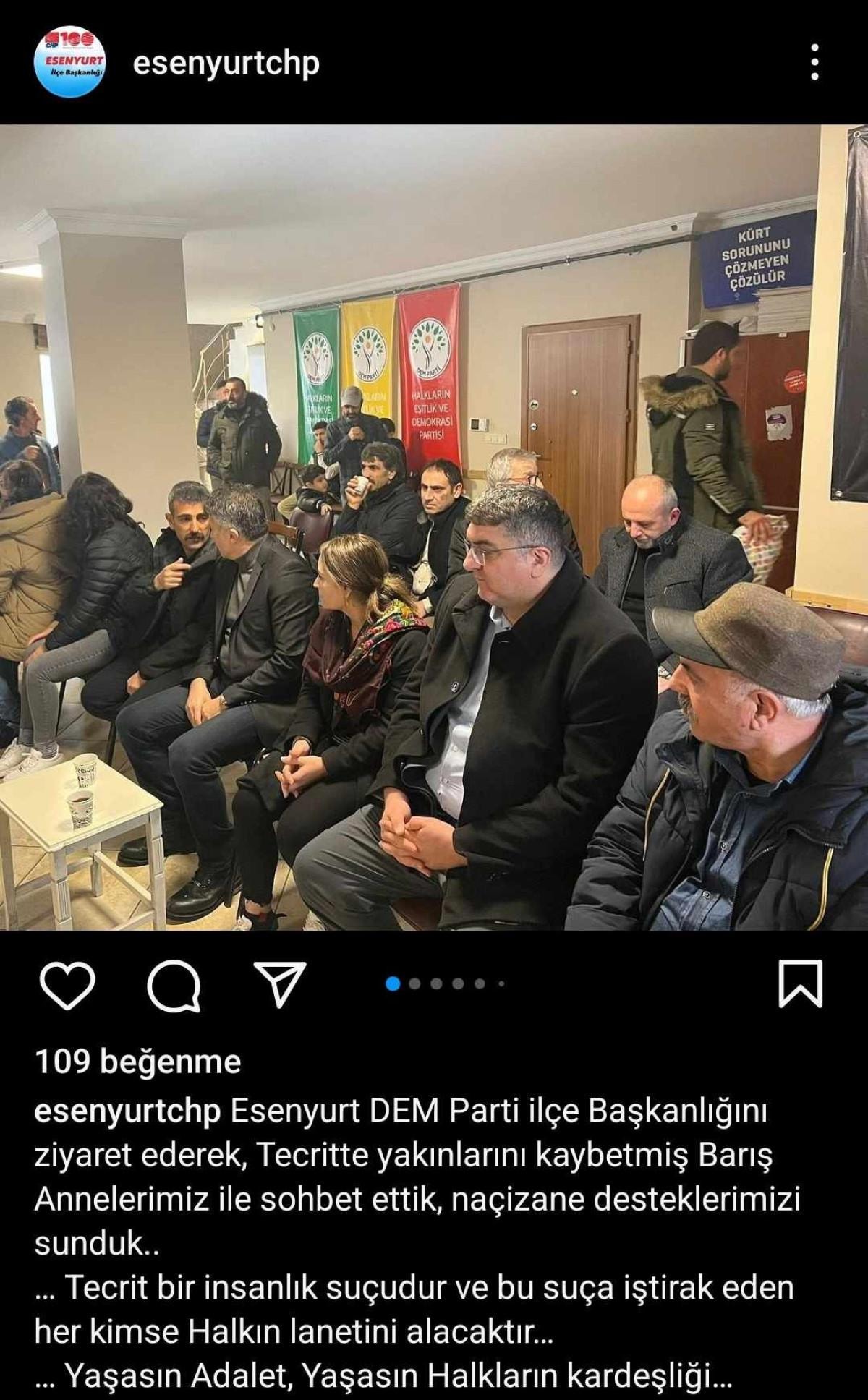 CHP'li Esenyurt İlçe Başkanı Hüseyin Ergün başkanlığındaki heyetin Öcalan posterleri önünde slogan atılan binayı ziyareti yine CHP'nin resmi sosyal medya hesaplarından paylaşıldı.