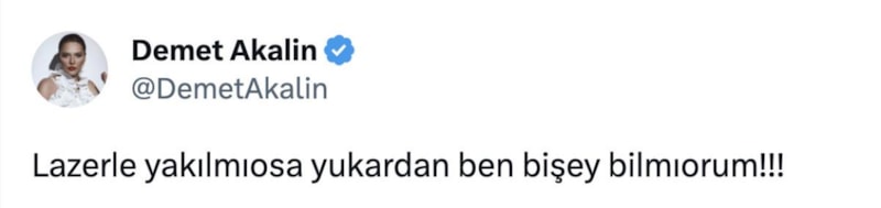 Twitter hesabından Çanakkale yangınıyla ilgili yorum yapan Demet Akalın, düşüncelerini "Lazerle yakılmıyorsa yukardan ben bir şey bilmiyorum" şeklinde aktardı. O paylaşım yorum yağmuruna tutuldu.