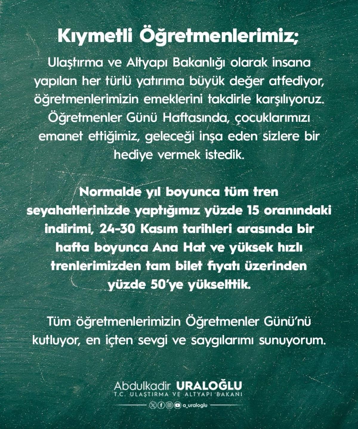 Ulaştırma ve Altyapı Bakanı Abdulkadir Uraloğlu, 24 Kasım Öğretmenler Günü nedeniyle 24-30 Kasım tarihleri arasında öğretmenlere yüzde 50 indirim uygulanacağını açıkladı.