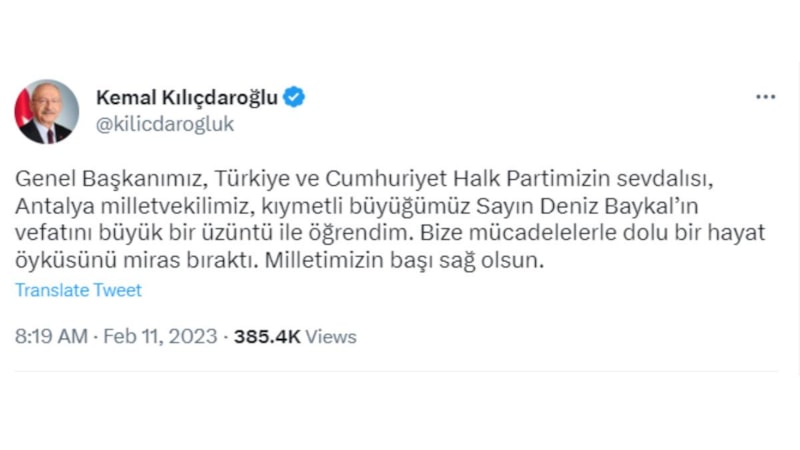 Kılıçdaroğlu paylaşımında, "Genel Başkanımız, Türkiye ve Cumhuriyet Halk Partimizin sevdalısı, Antalya milletvekilimiz, kıymetli büyüğümüz Sayın Deniz Baykal'ın vefatını büyük bir üzüntü ile öğrendim. Bize mücadelelerle dolu bir hayat öyküsünü miras bıraktı. Milletimizin başı sağ olsun." sözlerine yer verdi.