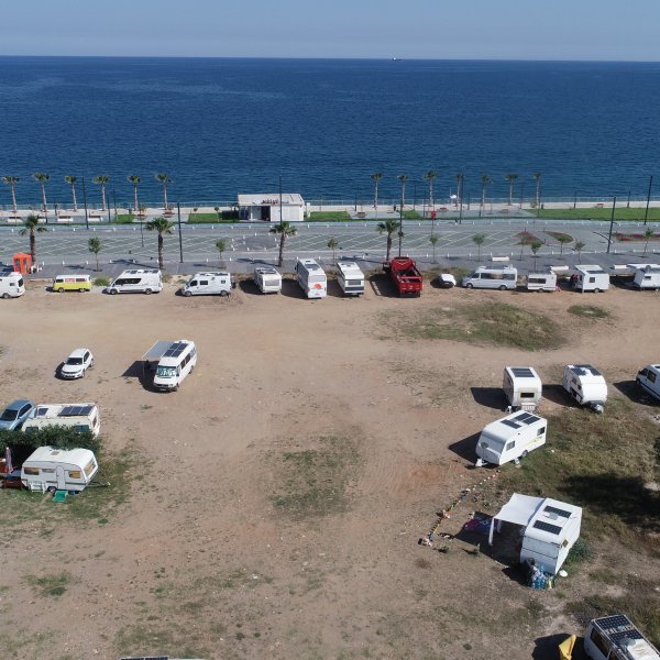 Dünyaca ünlü Konyaaltı sahili kıyısına yakın bir bölgede, 20'nin üzerinde karavanda sosyal mesafe kuralına uygun bir hayat yaşanıyor.