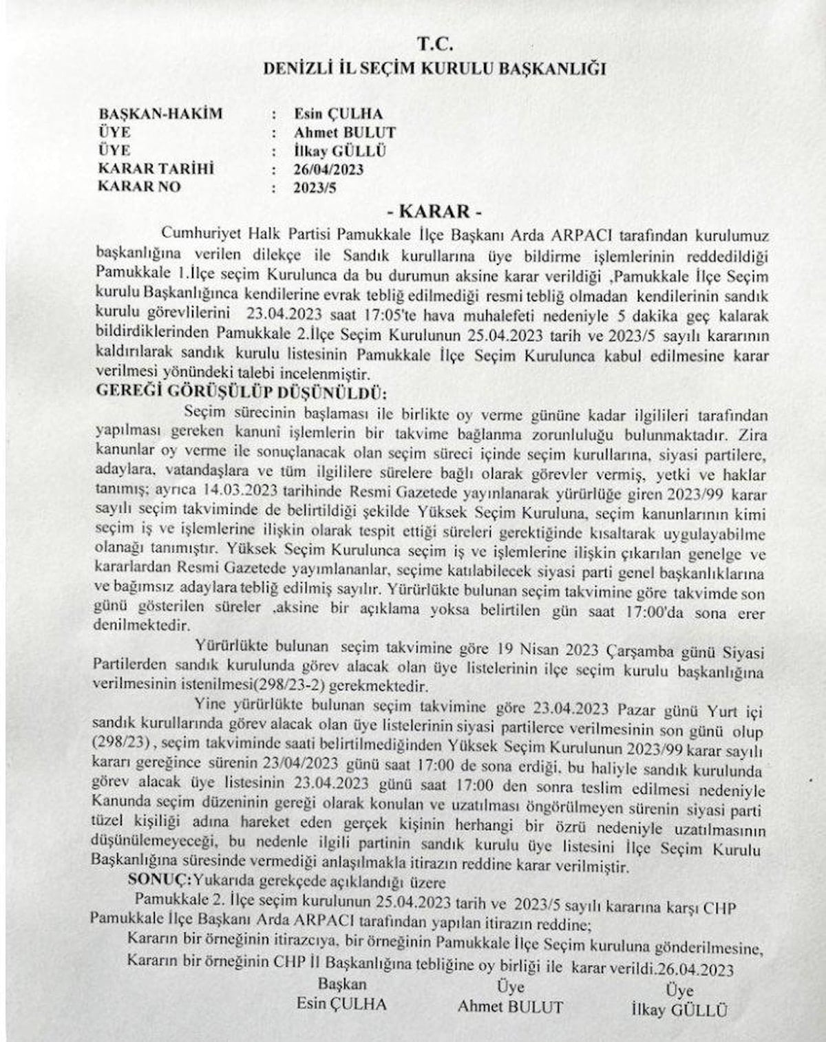 CHP Pamukkale İlçe Başkanlığı tarafından hazırlanan 400 kişilik sandık görevlisi listesi, en son Pazar günü saat 17.00'ye kadar Yüksek Seçim Kuruluna teslim edilmesi gerekirken, 5 dakikalık gecikme ile 17.05'te ulaştırıldı.