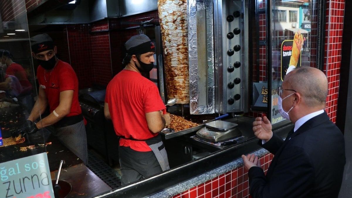 Esnafa uyarılarda bulunan Atik, bir dönerci dükkanında ustanın maskeyi burnunu açıkta bırakacak şekilde takmasına ve işletme çalışanlarının eldiven takmamasına tepki göstererek kapatma cezası uygulattı.