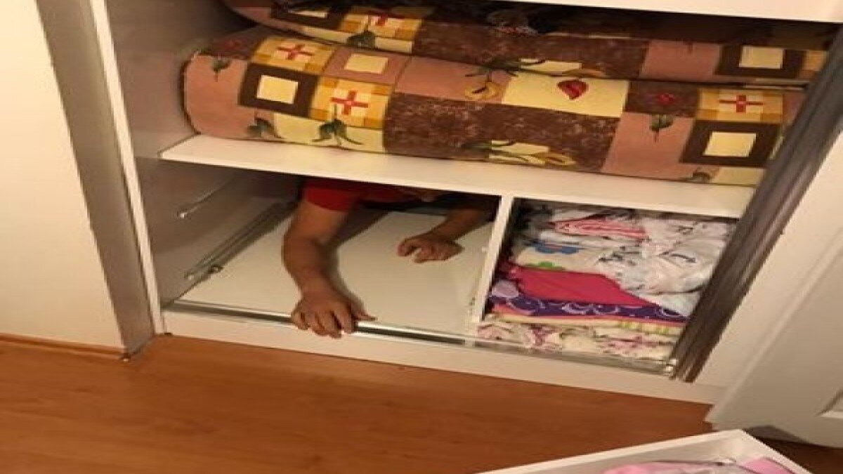 Şüpheli şahısların bulunduğu evde özel olarak tasarlanmış olan elbise dolabına oluşturdukları gizli bölmede 1 şüpheli şahıs yakalandı.