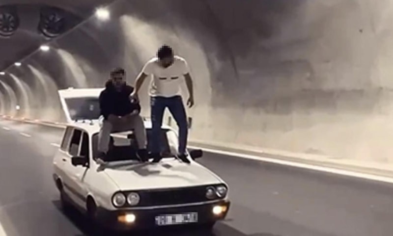Trafik kurallarını hiçe sayan şahıslar, tünelde durdurdukları aracın arkasında aynı hareketlerini sürdürdü.