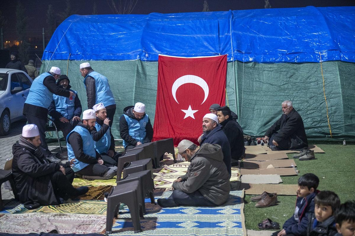 Erzurumluoğlu Camisi önündeki çadır kentte yatsı namazına müteakip düzenlenen programda depremde hayatını kaybedenler için dualar edildi.