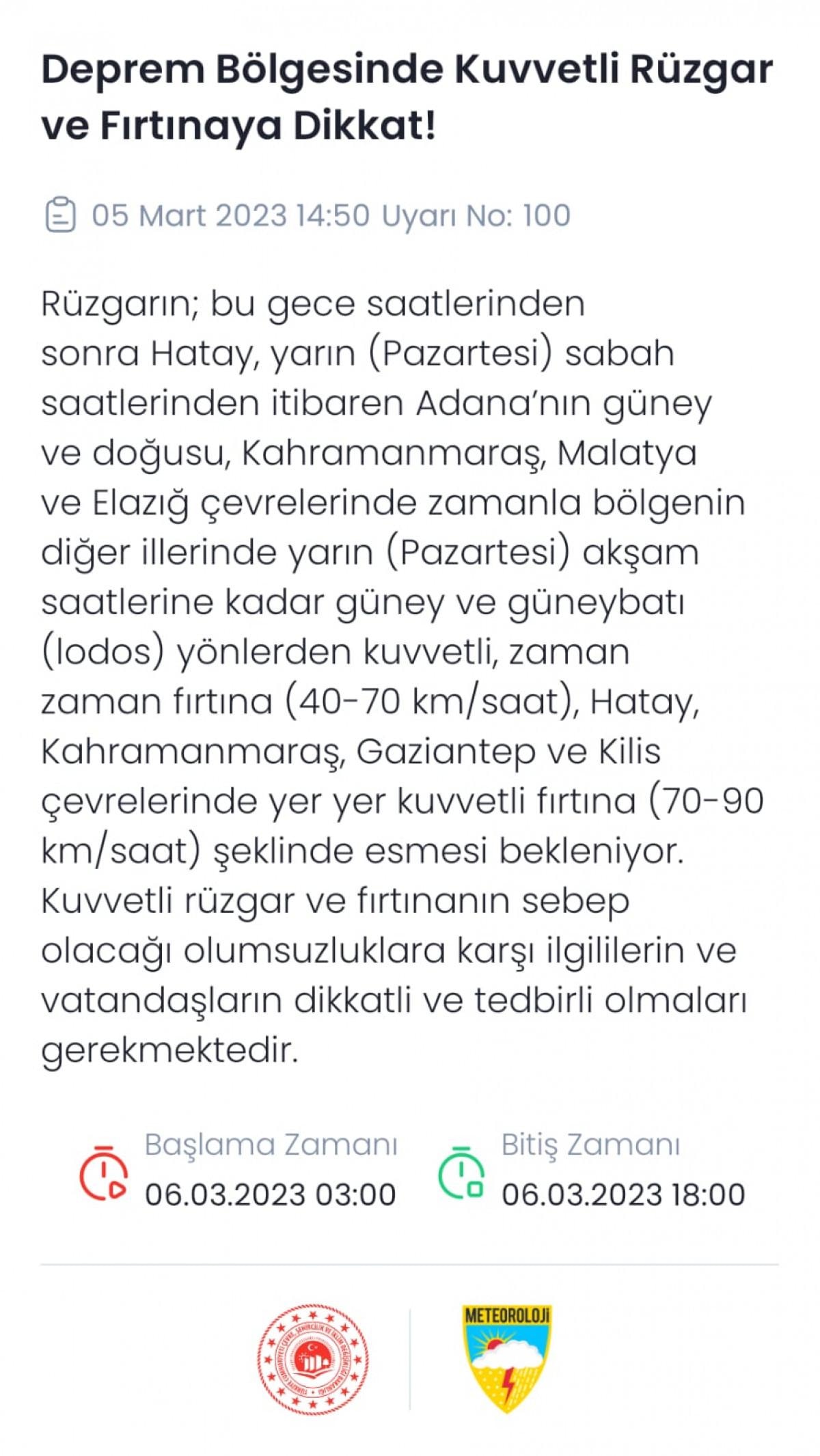 Rüzgarın; bu gece saatlerinden sonra Hatay, yarın (Pazartesi) sabah saatlerinden itibaren Adana'nın güney ve doğusu, Kahramanmaraş, Malatya ve Elazığ çevrelerinde zamanla bölgenin diğer illerinde yarın (Pazartesi) akşam saatlerine kadar güney ve güneybatı (lodos) yönlerden kuvvetli, zaman zaman fırtına (40-70 km/saat), Hatay, Kahramanmaraş, Gaziantep ve Kilis çevrelerinde yer yer kuvvetli fırtına (70-90) km/saat) şeklinde esmesi bekleniyor. Kuvvetli rüzgar ve fırtınanın sebep olacağı olumsuzluklara karşı ilgililerin ve vatandaşların dikkatli ve tedbirli olmaları gerekmektedir.
