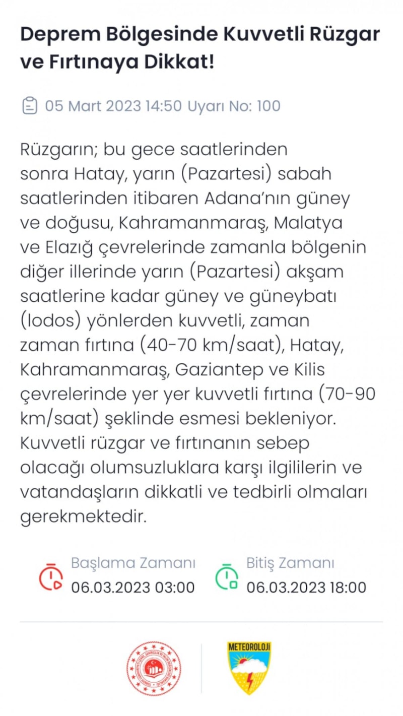 Meteoroloji Genel Müdürlüğü, deprem bölgesinde beklenen kuvvetli rüzgar ve fırtınaya ilişkin vatandaşlara uyarılarda bulundu.