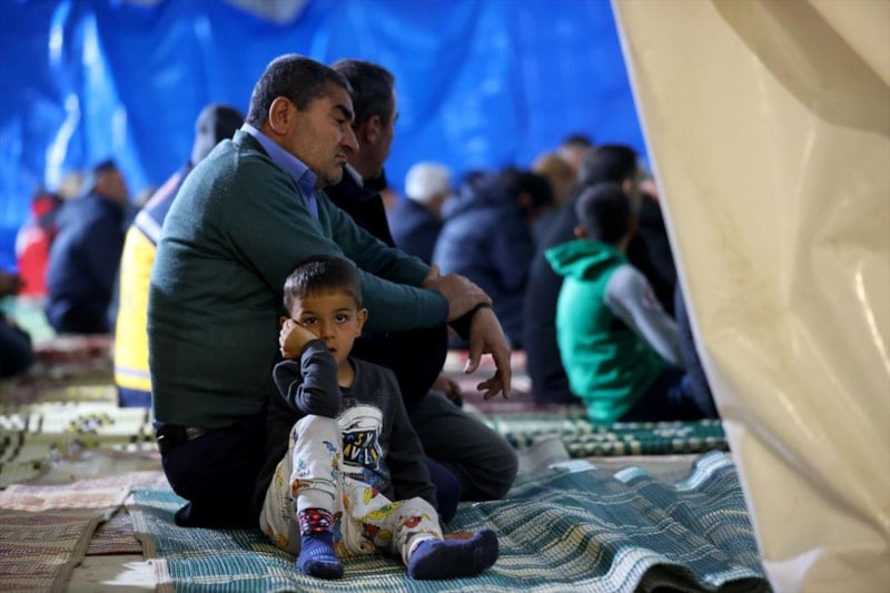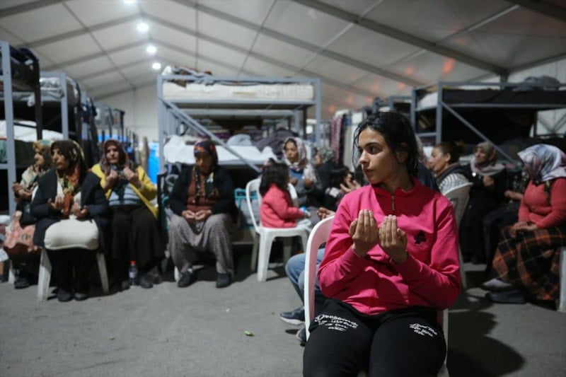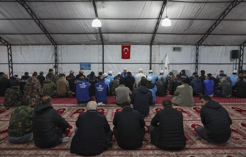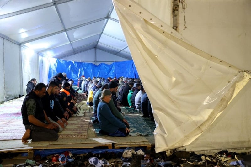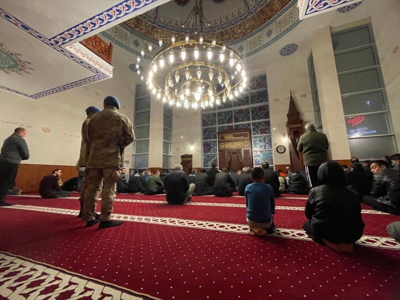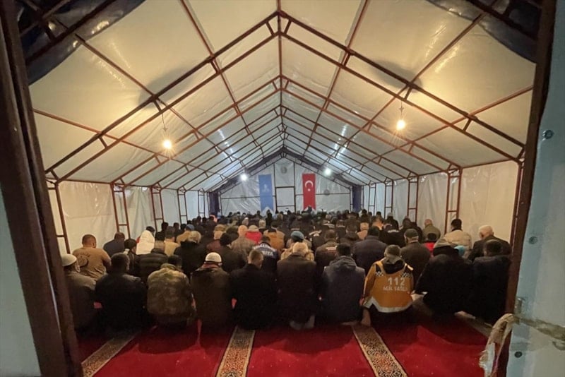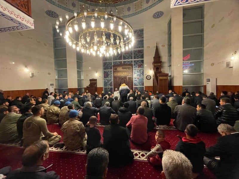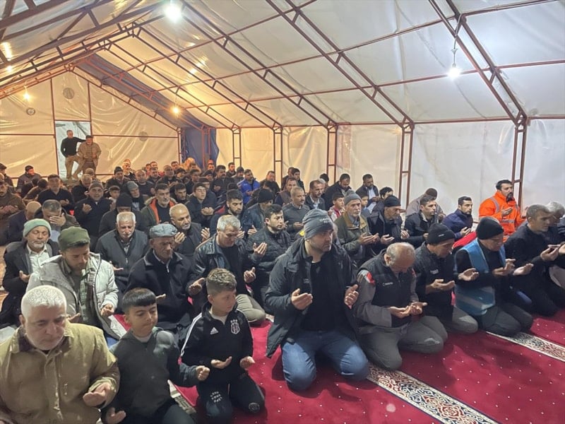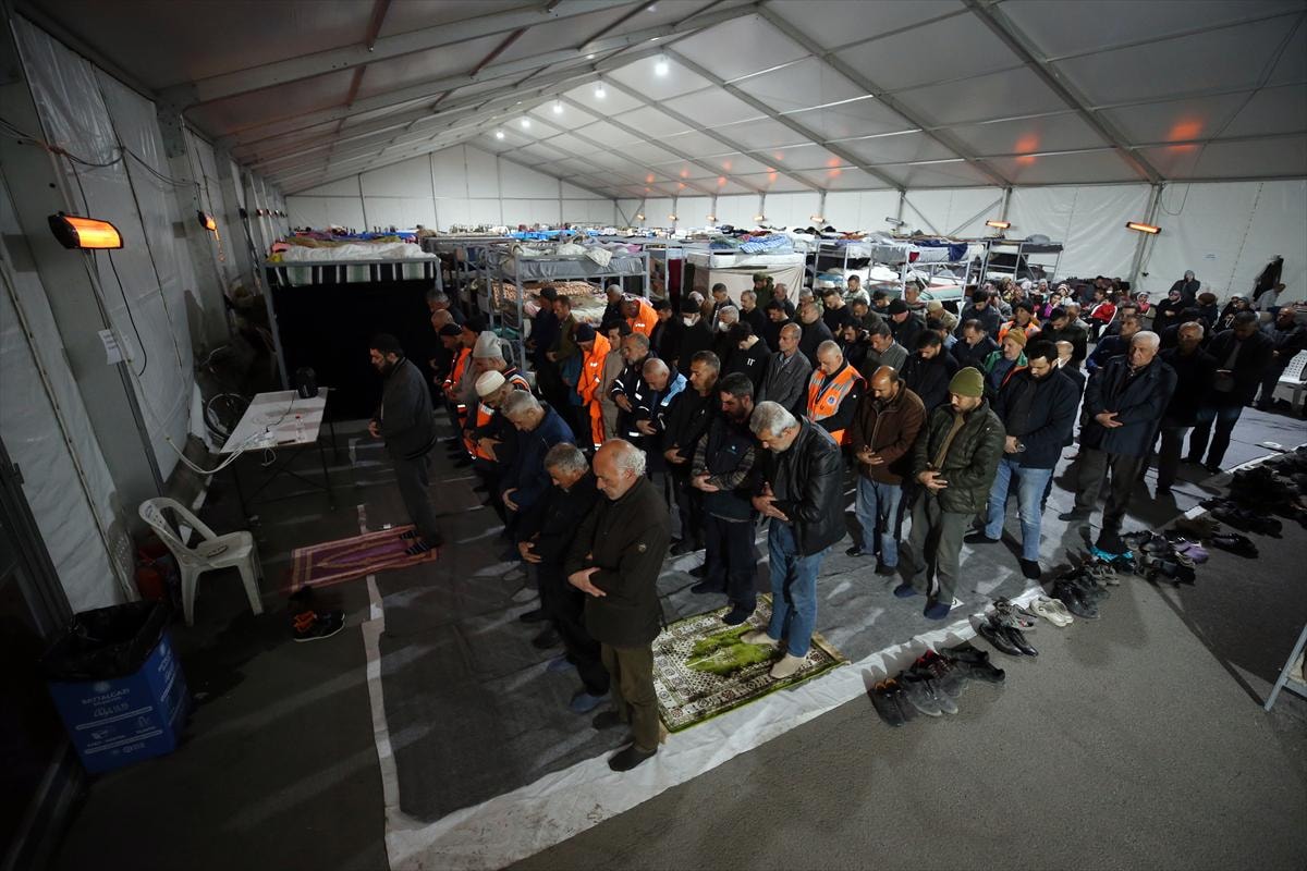 Osmaniye'de Tosyalı Sentetik Saha'ya kurulan geçici barınma merkezinde kalan vatandaşlar, Berat Kandili için merkezin yanında bulunan Tosyalı Camisi'ne geldi.