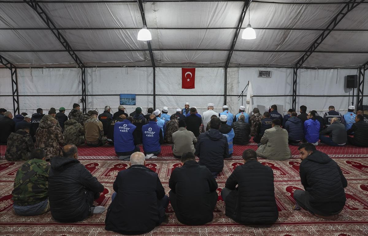 Adıyaman'da Eğriçay Parkı Çadır Kenti'ndeki depremzedeler ve görevliler, çadır mescid'de düzenlenen Berat Kandili programına katıldı.