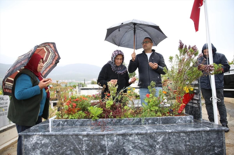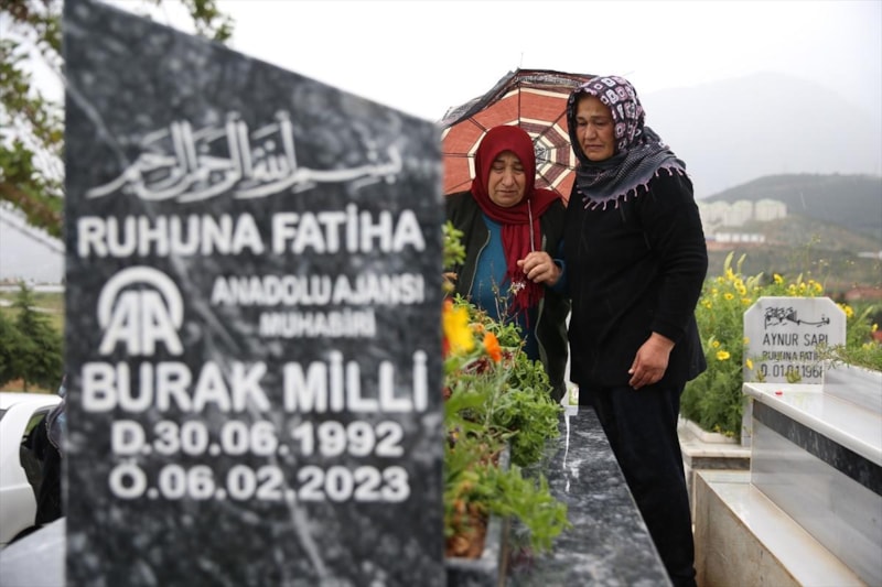 Depremde İskenderun ilçesindeki evinin enkazından 9 Şubat'ta eşi Ayşen Milli (30) ve 5 aylık kızı Eylül Lina ile cansız bedeni çıkartılan Anadolu Ajansı muhabiri Burak Milli'nin (31) Çankaya Mezarlığı'ndaki kabri de ziyaret edildi.