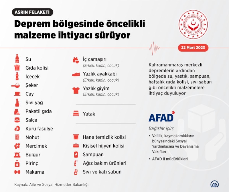 Aile ve Sosyal Hizmetler Bakanlığı, asrın felaketinin ardından bölgede su, yastık, şampuan, haftalık gıda kolisi, sıvı sabun gibi öncelikli malzemelere ihtiyaç duyulduğunu açıkladı.