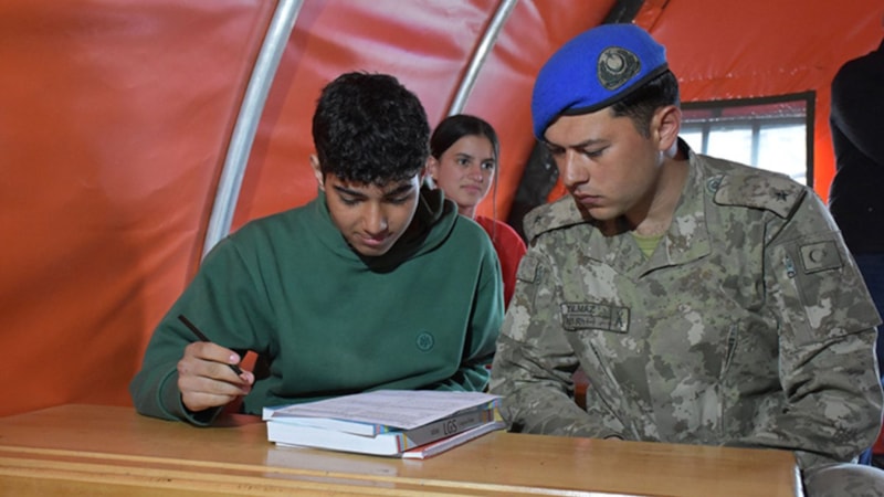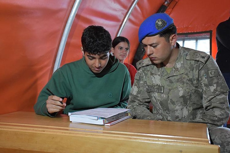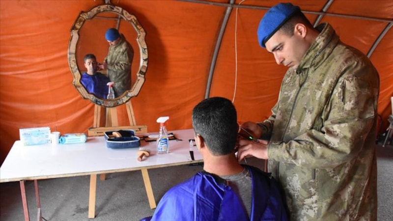 Afetzedeleri tıraş da eden Mehmetçik, lise ve üniversiteye hazırlanan öğrencilere destek veriyor.