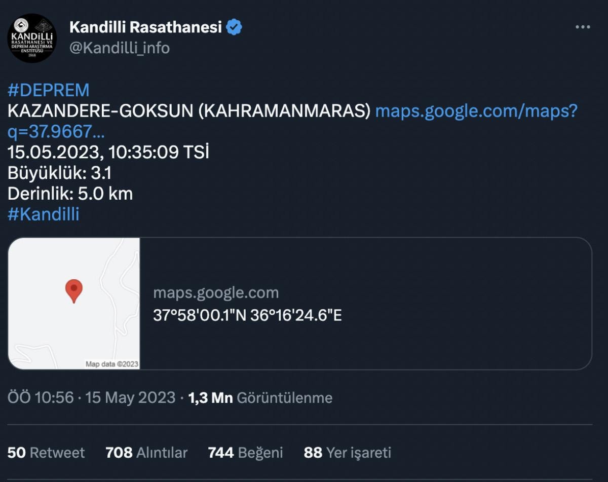 Kandili Rasathanesi, afetin merkez üstü Kahramanmaraş'ta 10:35:09 'da yeni bir deprem meydana geldiğini duyurdu.