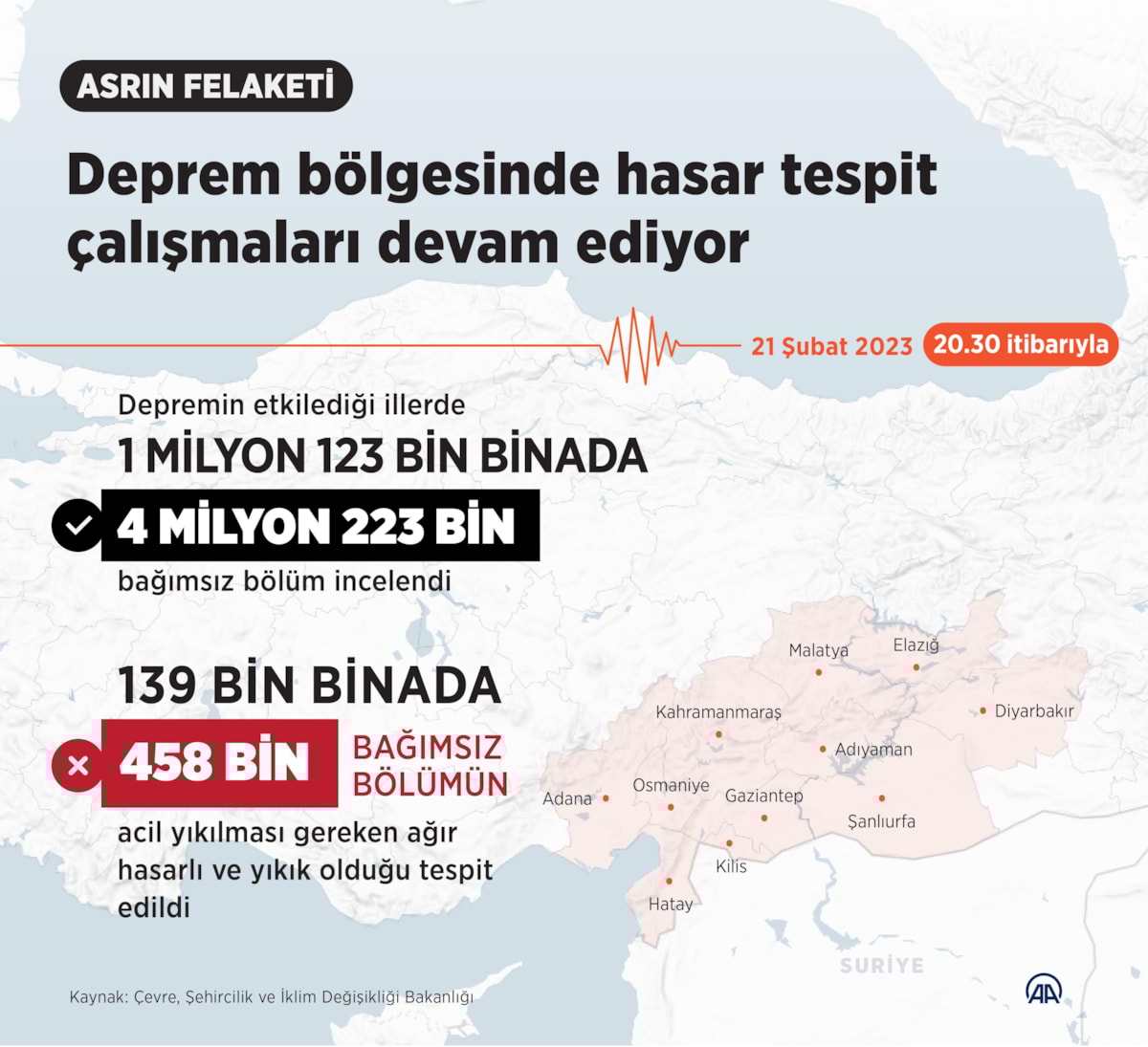 Bakanlık, bugün itibarıyla hasar tespit çalışmaları kapsamında, 1 milyon 123 bin binadaki 4 milyon 223 bin bağımsız birimde inceleme yaptı.