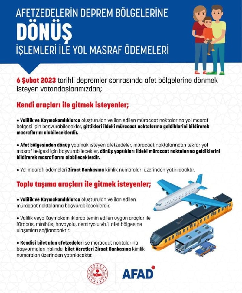 AFAD’ın duyurusuna göre, 6 Şubat tarihli depremler sonrasında afet bölgesine dönmek isteyen depremzede vatandaşlar kendi aracı ile gitmeleri halinde, Valilik ve Kaymakamlıklarca oluşturulacak ve ilan edilecek müracaat noktalarında yol masraf belgesi için başvurabilecekler.