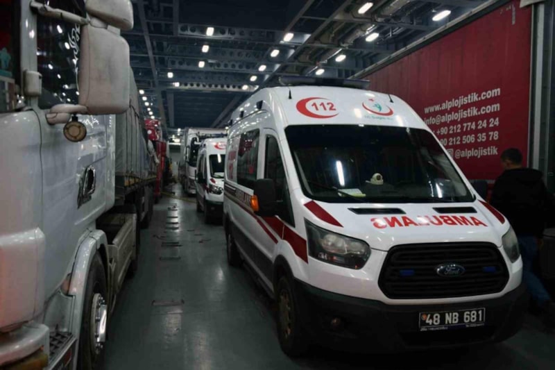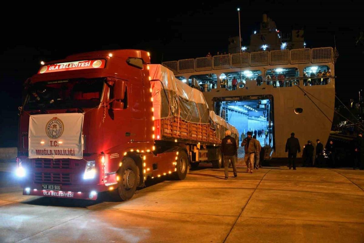 Aksaz Deniz Üs Komutanlığı'nın desteği ile ambulans, iş makineleri, tıbbi yardım ve diğer yardım malzemeleri askeri gemilerle deprem bölgesine ulaştırılıyor.