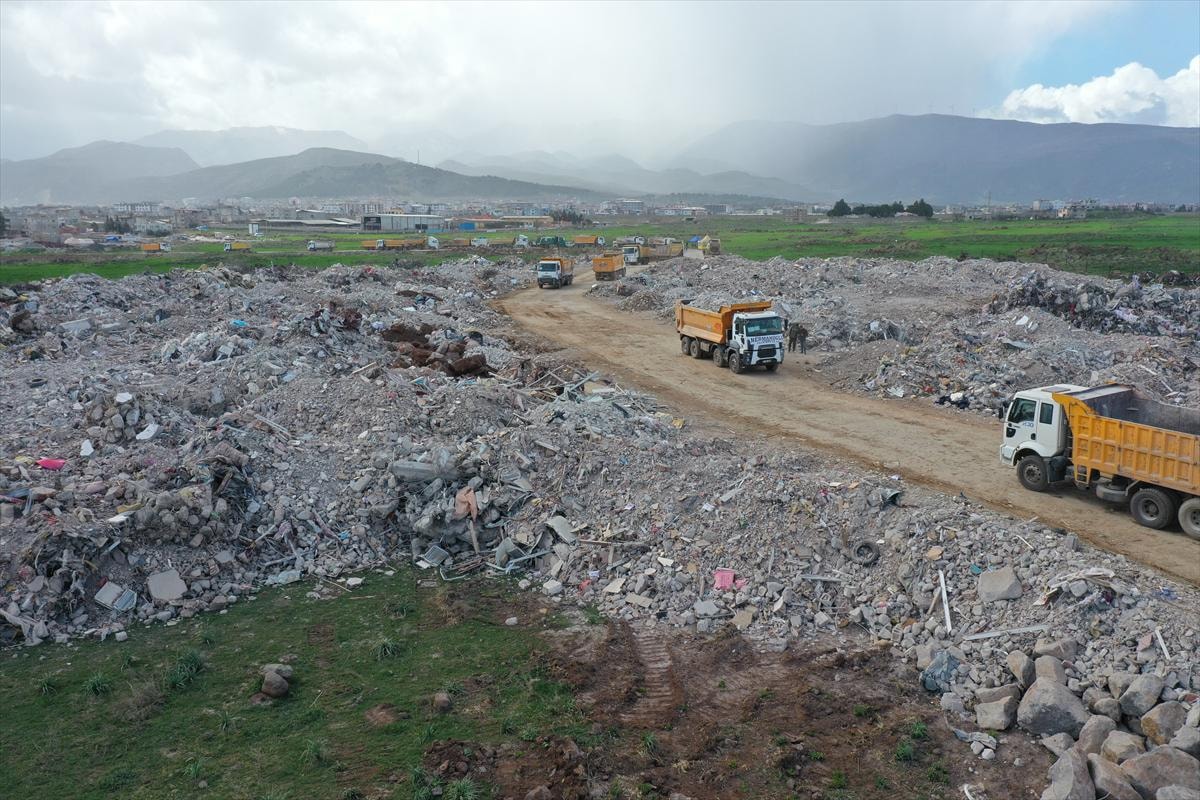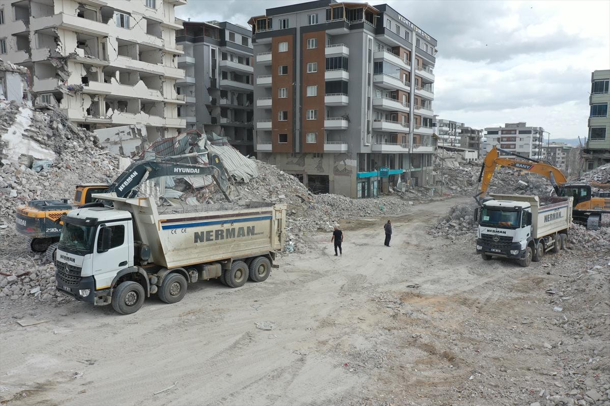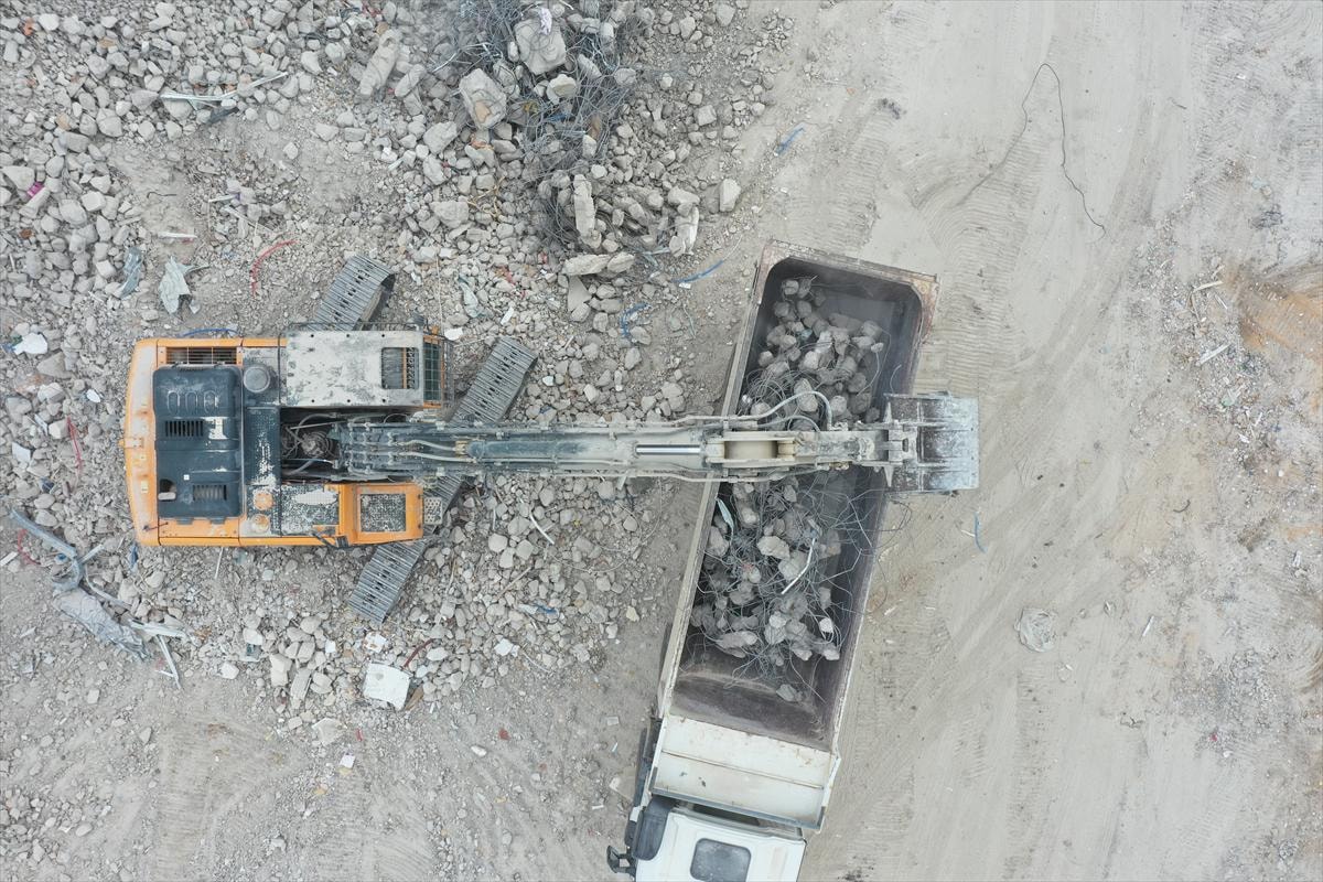 Depremler nedeniyle iki ilçede de yıkılan binaların enkazı, belirlenen noktalara taşınıyor.