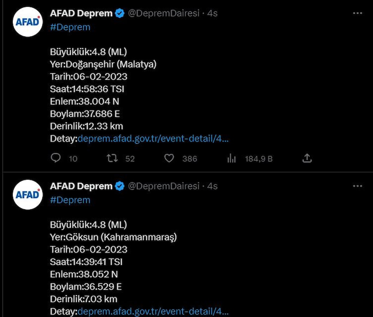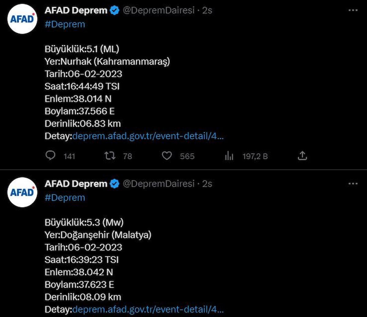 Afet ve Acil Durum Yönetimi Başkanlığının (AFAD) internet sitesinde yer alan son depremler şu şekilde;
