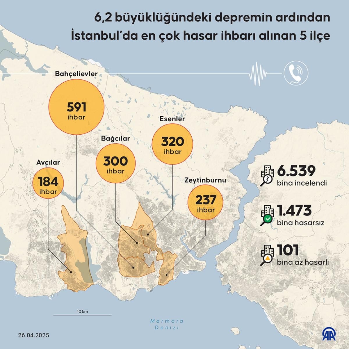 Depremde gelen ihbarlar sonucunda 6 bin 539 bina incelendi. 1.473 bina hasarsız bulundu. 101 binada ise az hasara rastlandı.