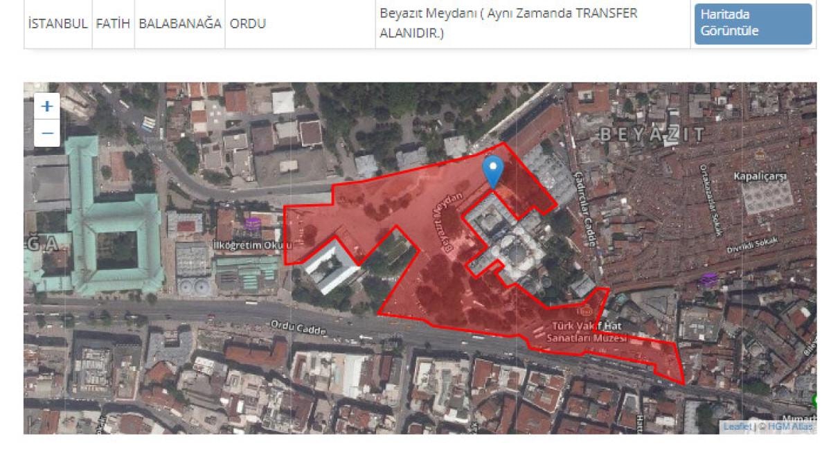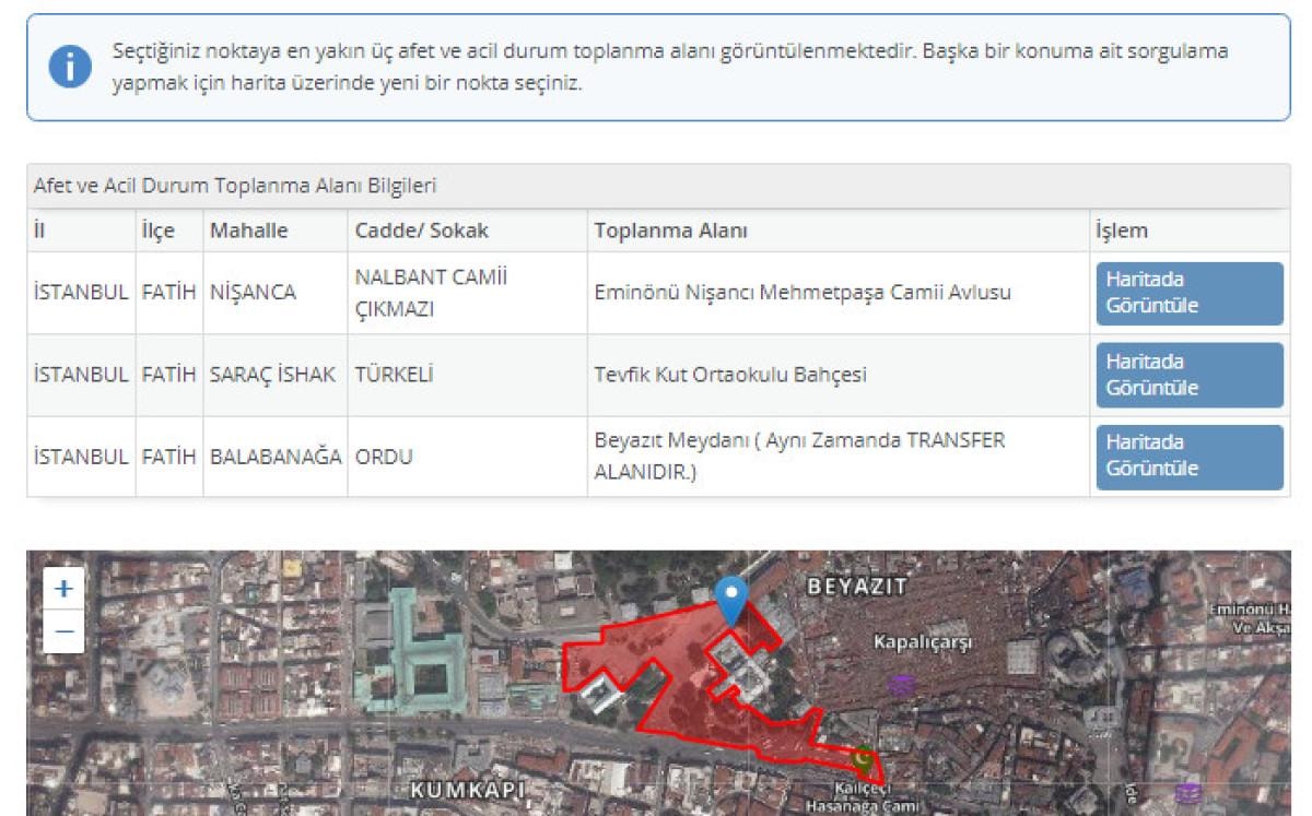 Seçtiğiniz toplanma alanını daha yakından görmek istediğinizde "Haritada Görüntüle" kısmına tıklayarak incelemek mümkün.