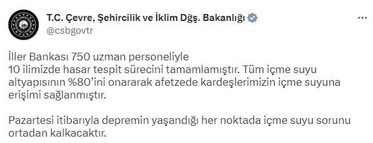 İller Bankası 750 uzman personeliyle 10 ilimizde hasar tespit sürecini tamamlamıştır. Tüm içme suyu altyapısının yüzde 80’ini onararak afetzede kardeşlerimizin içme suyuna erişimi sağlanmıştır.