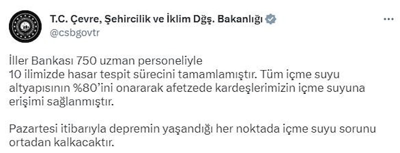 Çevre, Şehircilik ve İklim Değişikliği Bakanlığı, afet bölgelerinde içme suyu altyapısının yüzde 80'inin onarıldığını açıkladı.