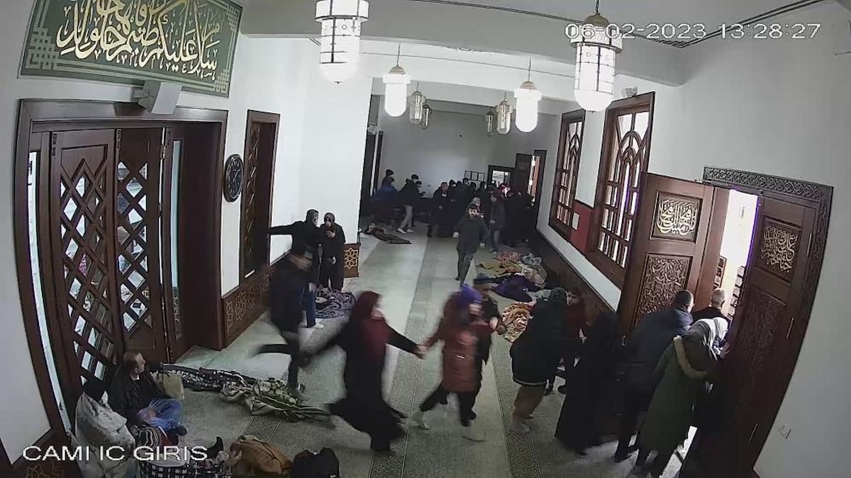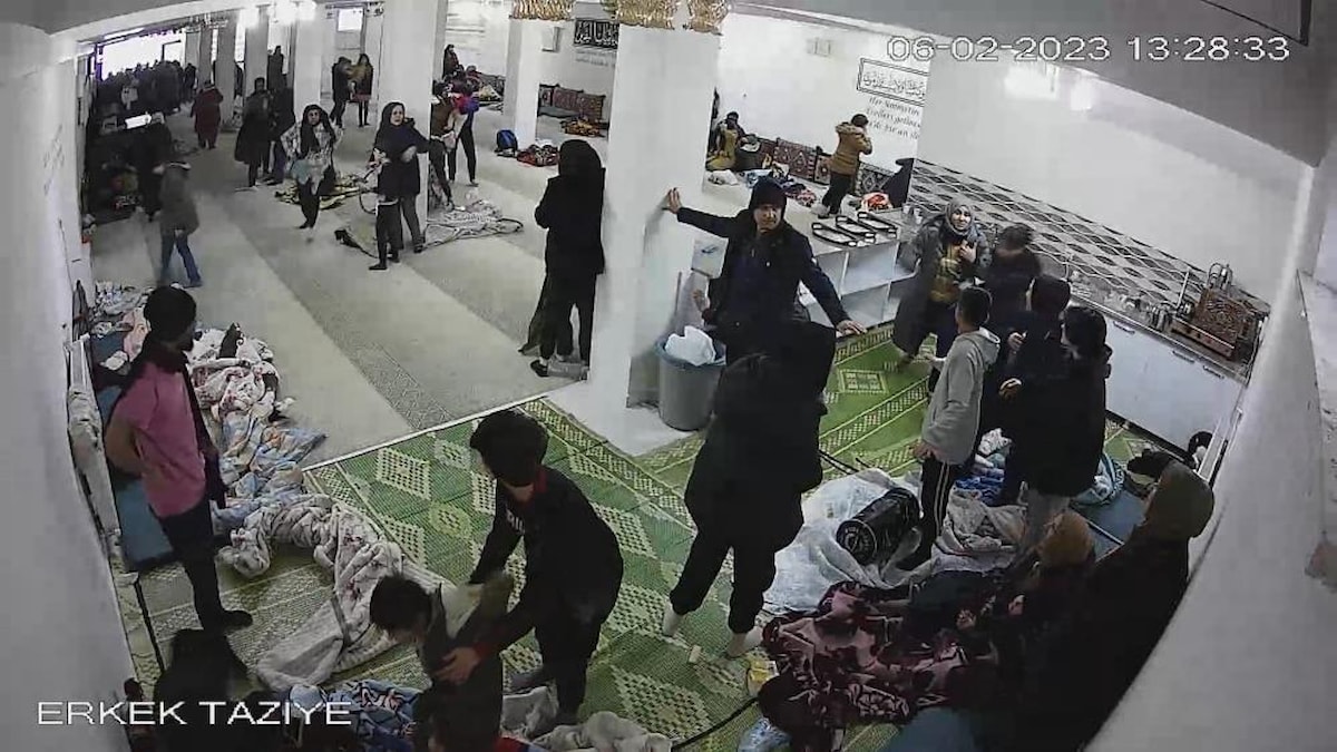 Deprem sırasında vatandaşların panik anları görülürken, emekleyen, kedisini arayan, işaret parmağını kaldırarak camide tekbir getiren ve kolonlara sarılanlar yer alıyor.