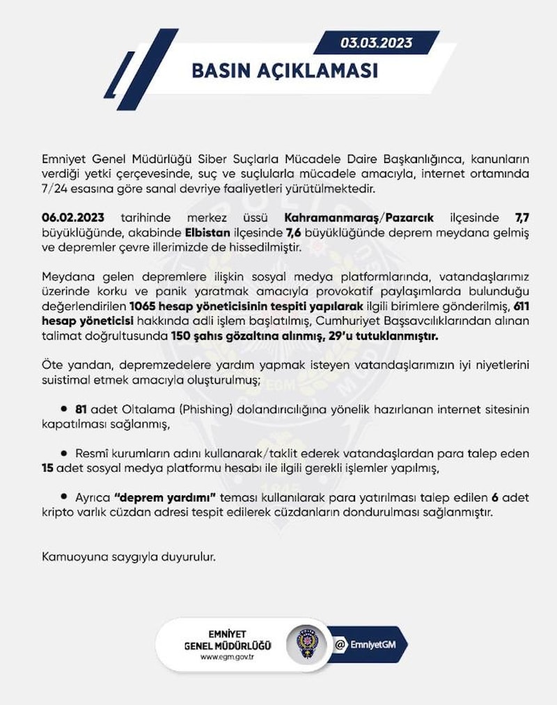 Öte yandan, depremzedelere yardım yapmak isteyen vatandaşlarımızın iyi niyetlerini suistimal etmek amacıyla oluşturulmuş; 81 adet Oltalama (Phishing) dolandırıcılığına yönelik hazırlanan internet sitesinin kapatılması sağlanmış, resmi kurumların adını kullanarak/taklit ederek vatandaşlardan para talep eden 15 adet sosyal medya platformu hesabı ile ilgili gerekli işlemler yapılmış, ayrıca “deprem yardımı” teması kullanılarak para yatırılması talep edilen 6 adet kripto varlık cüzdan adresi tespit edilerek cüzdanların dondurulması sağlanmıştır.