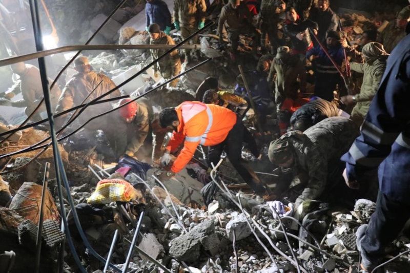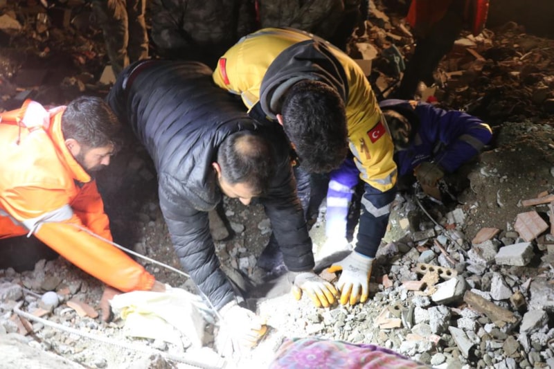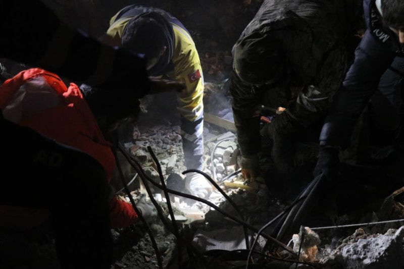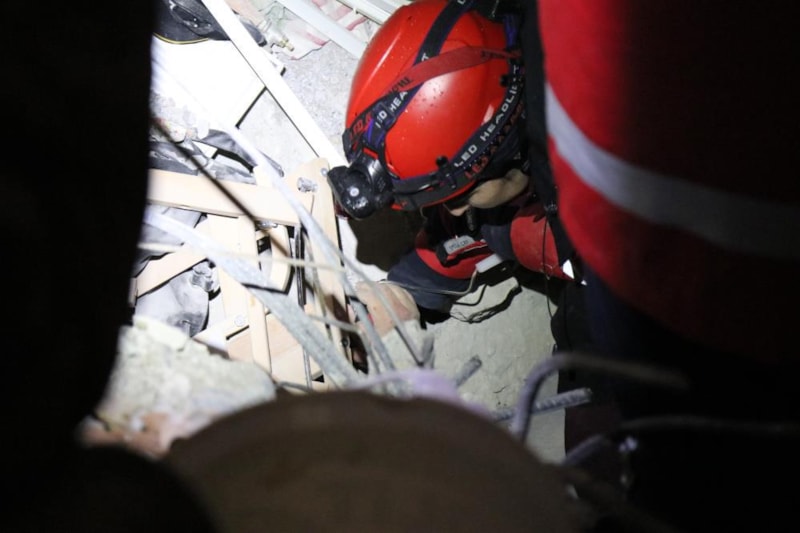 Yıkılan bir apartmanın enkazında afetten saatler sonra kurtarılan kadının aynı enkazda eşi ve çocuğunun cansız bedeni çıkarılınca ekipler gözyaşlarına boğuldu.