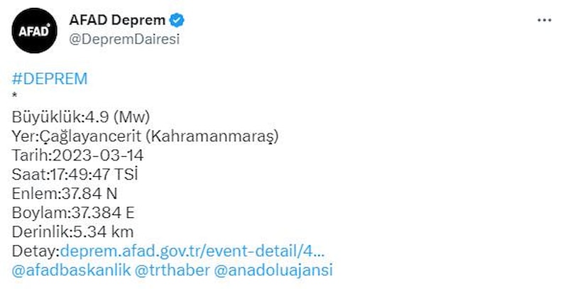 AFAD, Kahramanmaraş'ın Çağlayancerit ilçesinde saat 17.49 sıralarında derinliği 5.34 kilometre olan artçı depremi duyurdu.