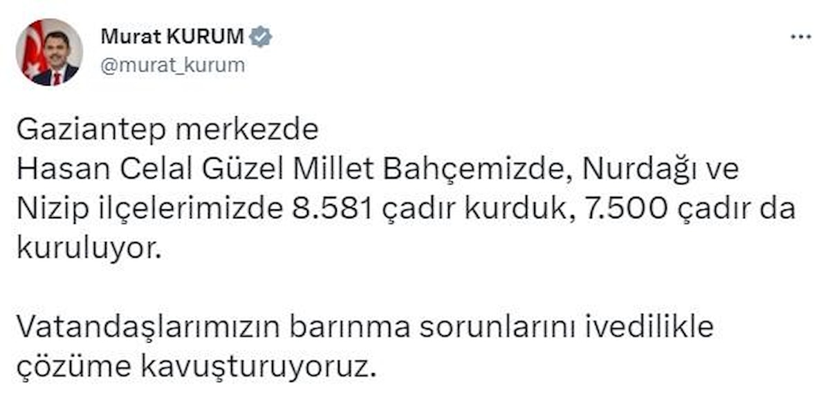 Murat Kurum, iki ilçede çadır kurulumunun devam ettiğini belirterek, şu notu düştü: