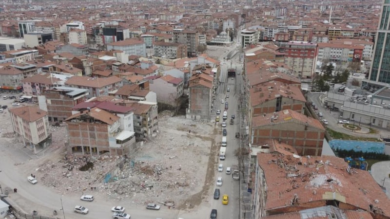 Drone ile havadan görüntülenen bölgede birçok caddede yaşanan yıkım sonrası enkazların kaldırıldığı görülüyor.