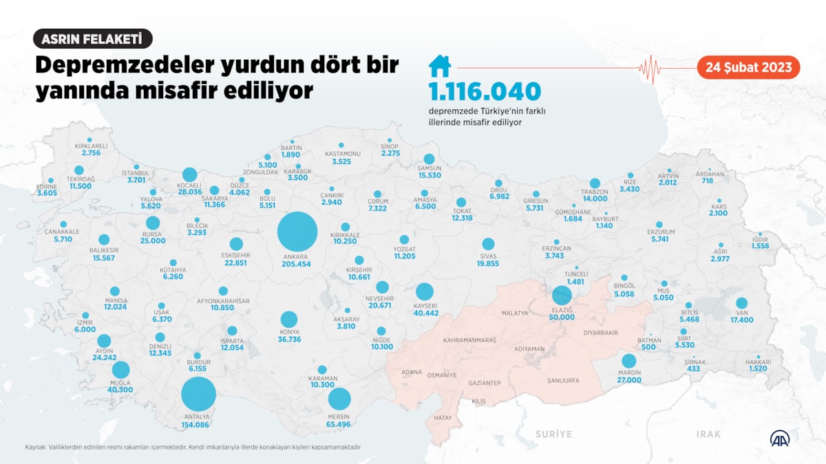 Bursa'da 25 bin, Adıyaman'ın kardeş ili olan Aydın'da 24 bin 242, Eskişehir'de 22 bin 851, Nevşehir'de 20 bin 671, Sivas'ta 19 bin 855, Van'da 17 bin 400, Balıkesir'de 15 bin 567, Samsun'da 15 bin 530, Trabzon'da 14 bin depremzede misafir ediliyor.
