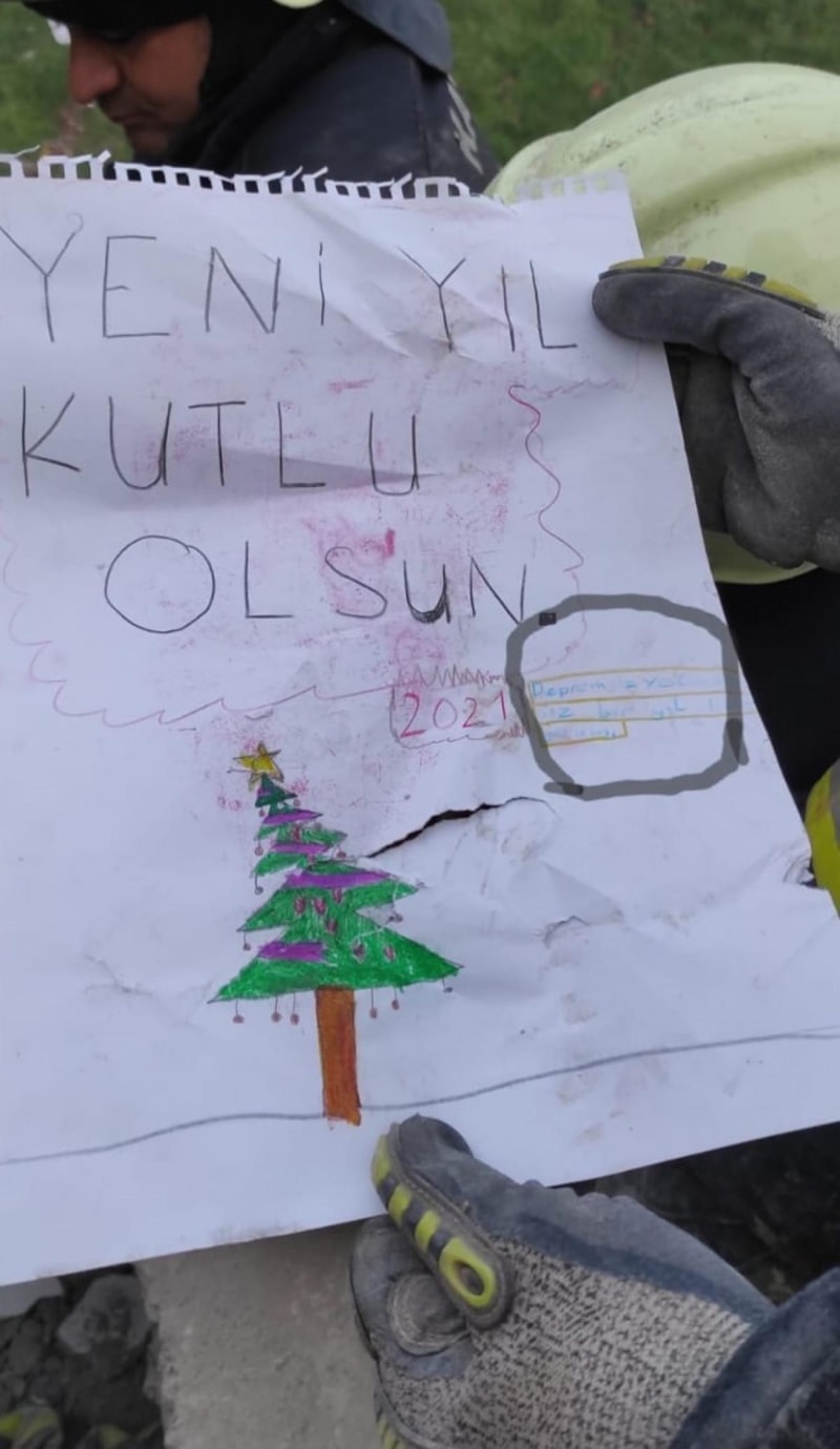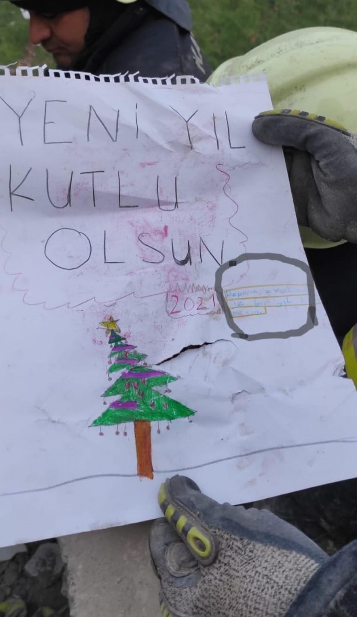 Bu resimde 2021 yılının yılbaşında çocuğumuz, 'Depremsiz ve koronasız bir yıl diliyorum' diye yazmış. Hiltiyi enkaza vurduğumuzda karşımıza çıkan ilk şey bu kağıttı. Elimize alıp, yazıyı görünce duygulandık.